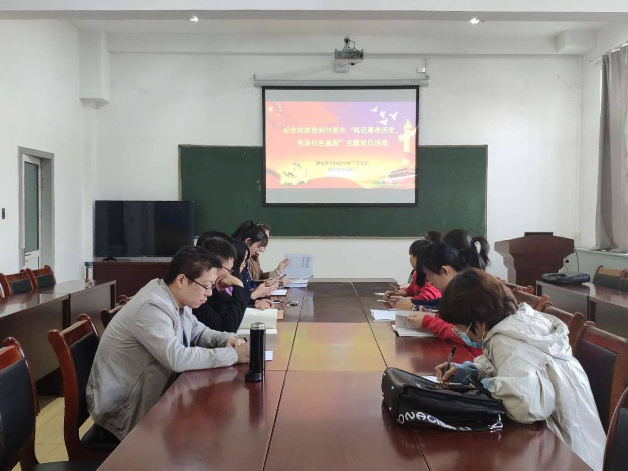 为纪念中国人民抗日战争胜利75周年,追思革命先烈的丰功伟绩,弘扬他们的无私奉献精神,2020年10月9日下午,院行政与电子党支部在四号楼二层多功能会议室开展了“铭记革命历史,传承红色基因”主题党日活动。支部全体党员参加了活动,此次党日活动由支部书记崔艳主持。