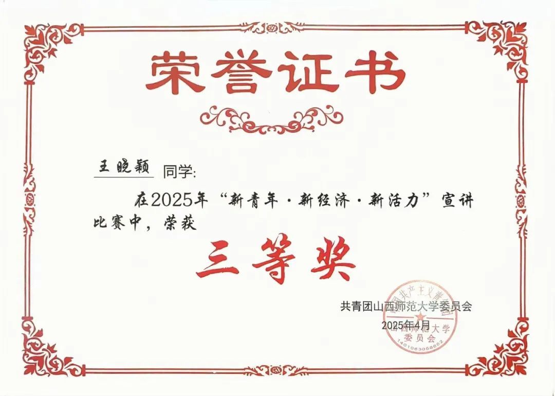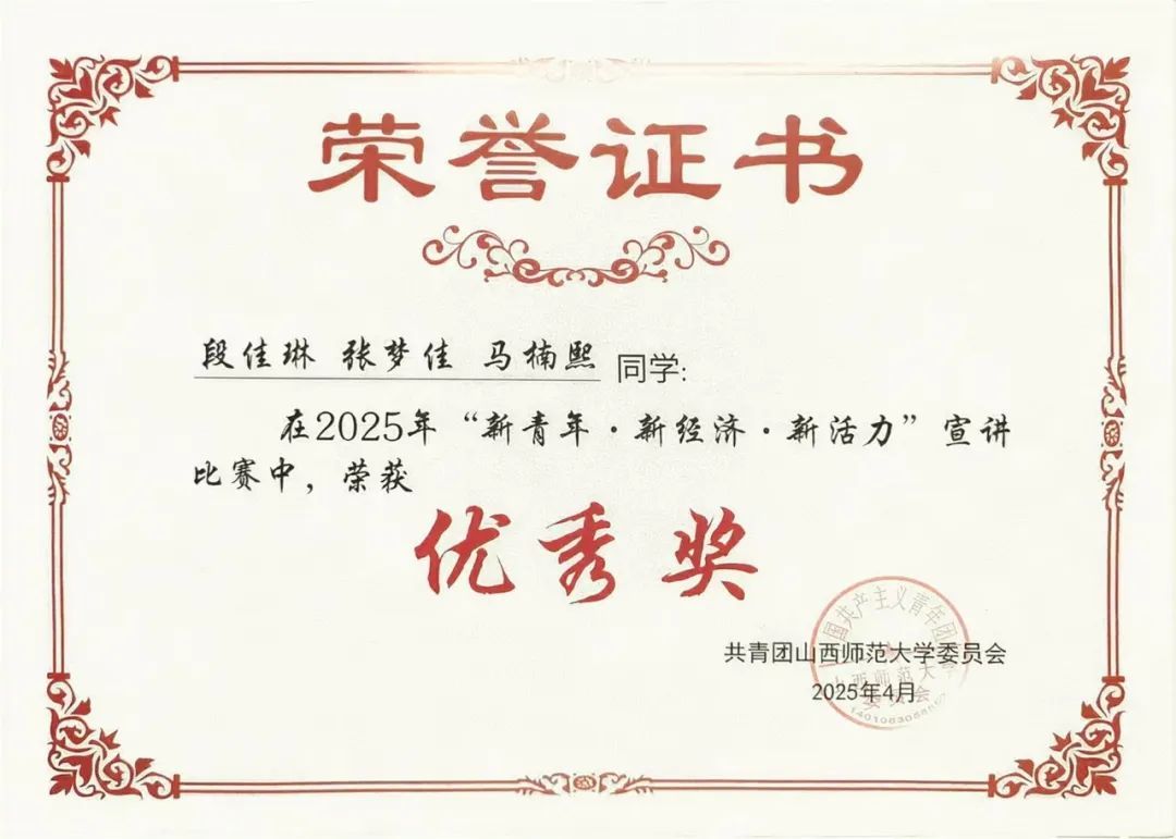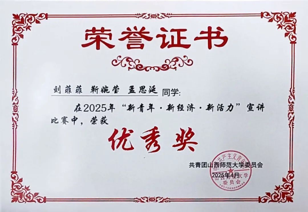 近日,由校团委举办的“新青年·新经济·新活力”宣讲比赛圆满落幕,云顶Casino亚洲官方入口-云顶娱乐官网下载 表现亮眼,推选的三支参赛队伍全部获奖,其中,《青春献科技,创新担使命 —— 新时代青年的科技创新征程》荣获三等奖,《青年逐梦科技创新,点燃山西经济引擎》、《青年铸科技脊梁,创新立时代坐标》两队获优秀奖,充分展现了物信学子的青春风采与扎实素养。