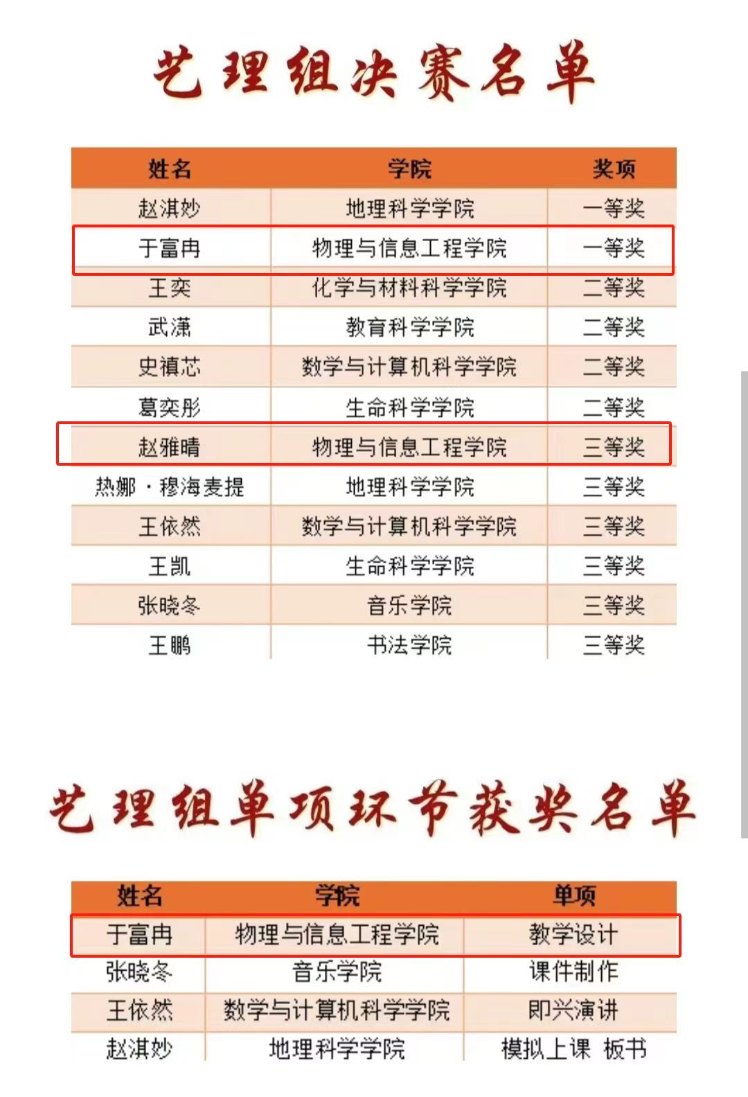 5月的校园,捷报频传。5月26日,校团委公布了2025年山西师范大学未来教师素质大赛获奖名单,云顶Casino 学子凭借扎实的专业功底与出色的教学素养,在赛场上绽放光芒,脱颖而出。于富冉、赵雅晴两位同学分别荣获艺理组一等奖和三等奖,其中于富冉同学还荣获教学设计单项奖。