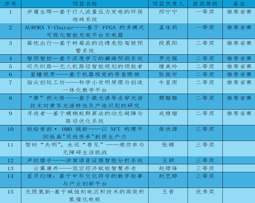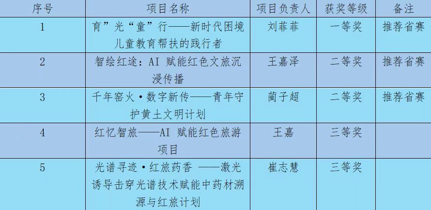 共20个项目获奖。其中,在高教主赛道中,获得一等奖2项,二等奖7项,三等奖5项,优秀奖1项;在青年红色筑梦之旅赛道中,荣获一等奖1项,二等奖2项,三等奖2项。其中推荐省赛的项目有12项。