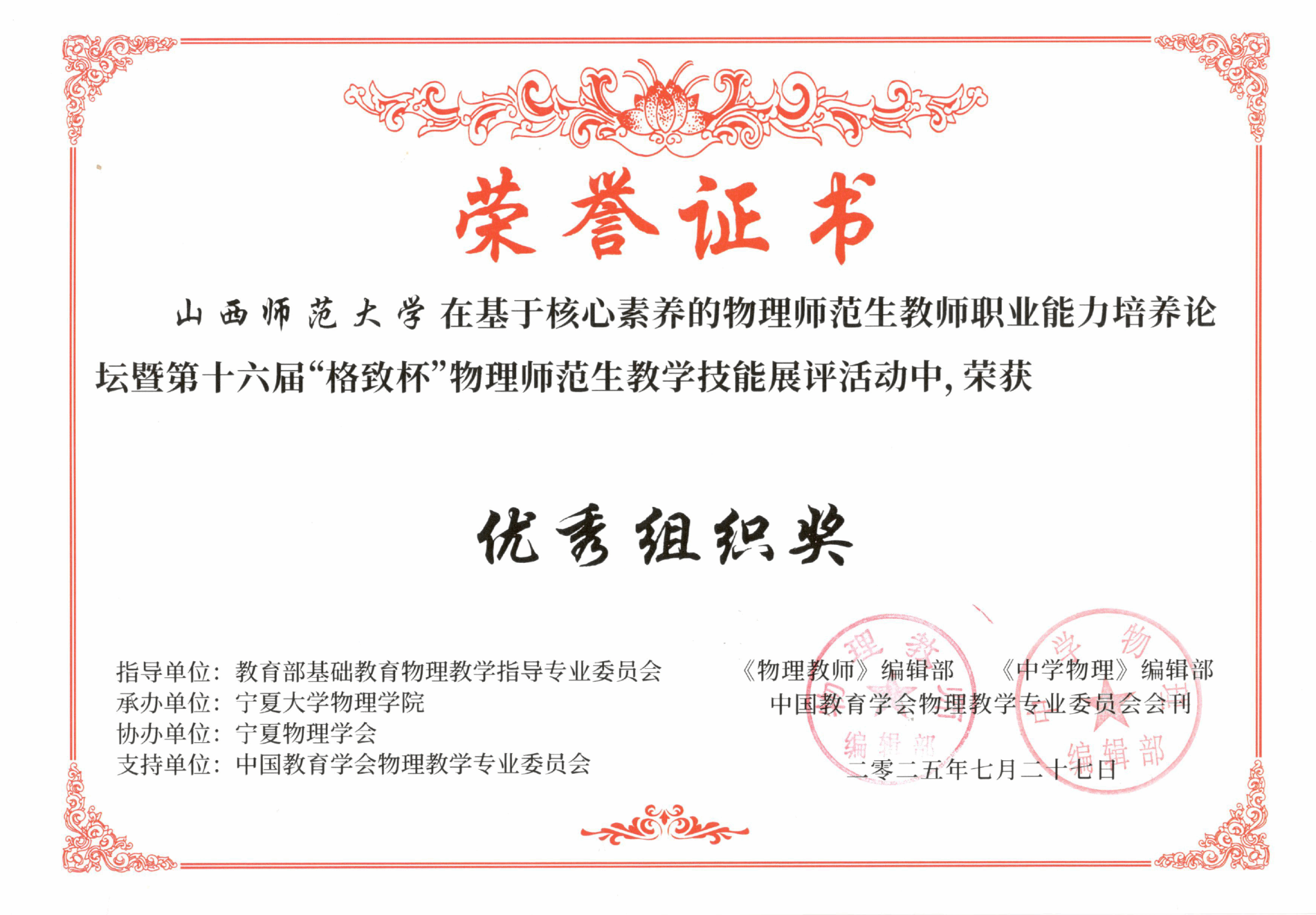 2025年7月25日至27日,基于核心素养的物理师范生教师职业能力培养论坛暨第十六届“格致杯”物理师范生教学技能展评活动在宁夏大学成功举行。本次活动由教育部基础教育物理教学指导专业委员会和中国教育学会物理教学专业指导委员会指导,《物理教师》编辑部、《中学物理》编辑部主办,宁夏大学承办。来自北京师范大学、华东师范大学、华中师范大学等116所高校的1400余名师生参加。