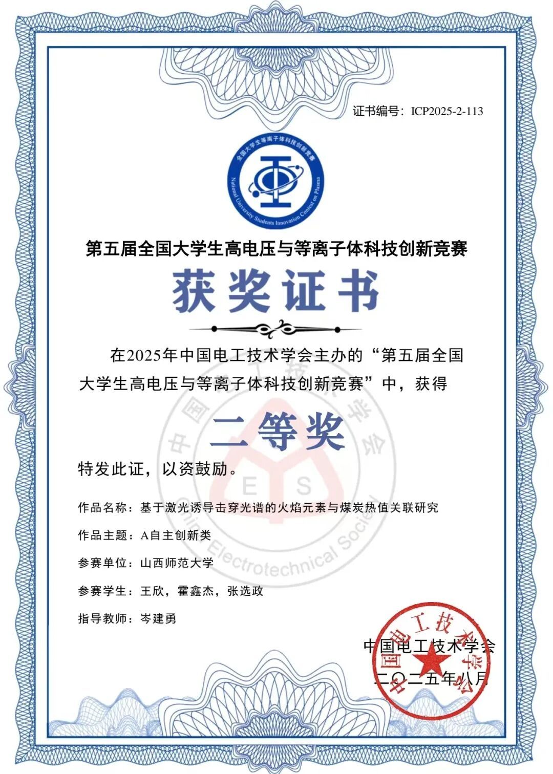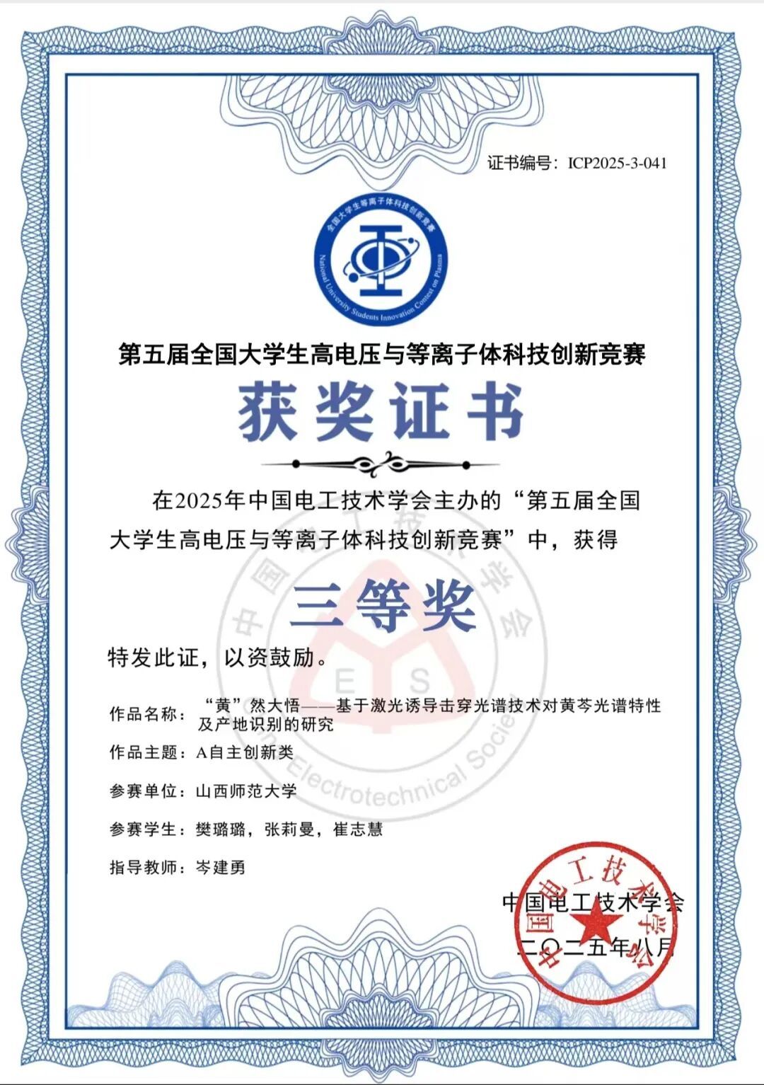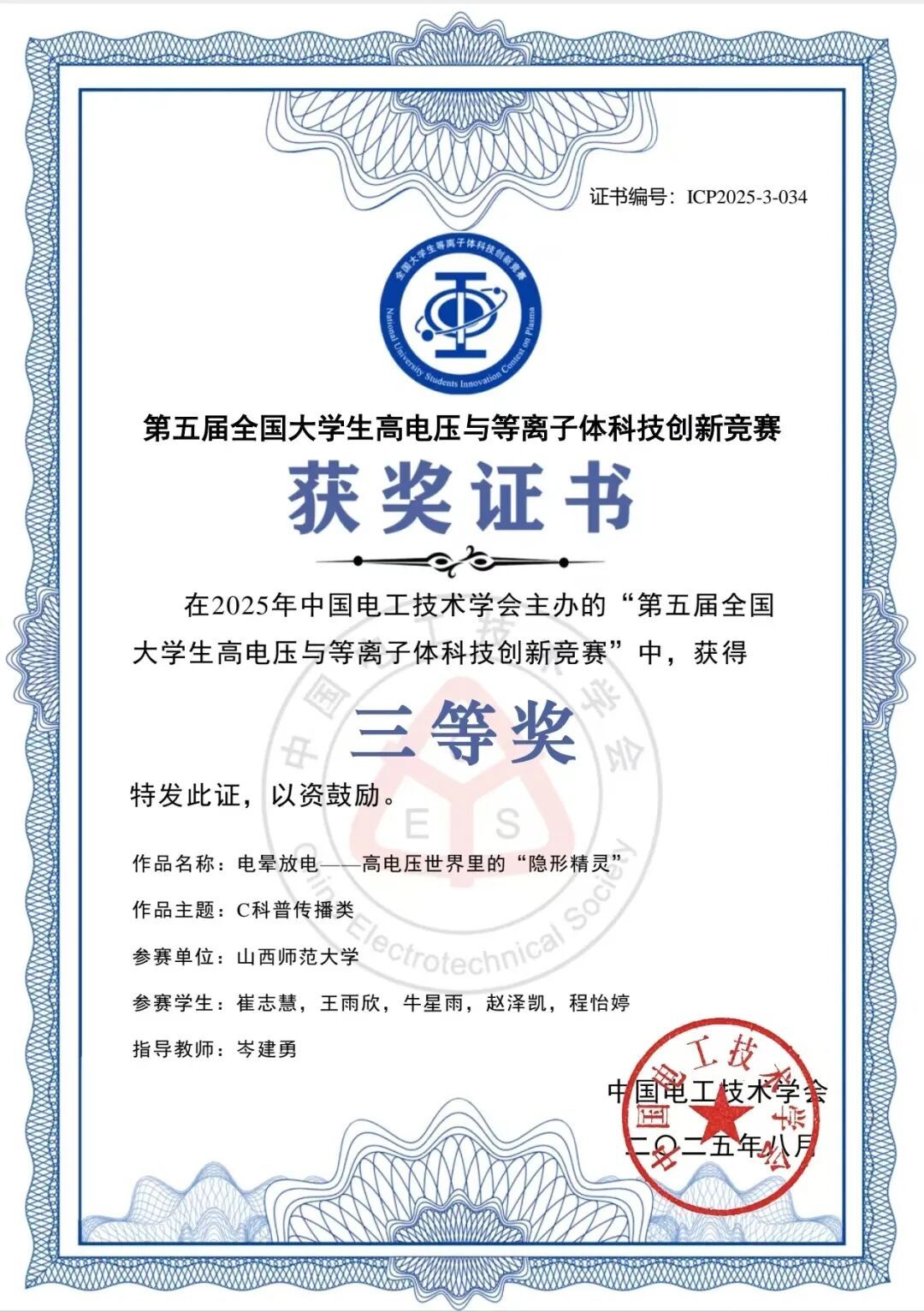 22025年8月8日至10日,第五届全国大学生高电压与等离子体科技创新竞赛在合肥工业大学顺利举办。经过激烈角逐,云顶Casino 斩获二等奖一项、三等奖两项,山西师范大学获评优秀组织单位。