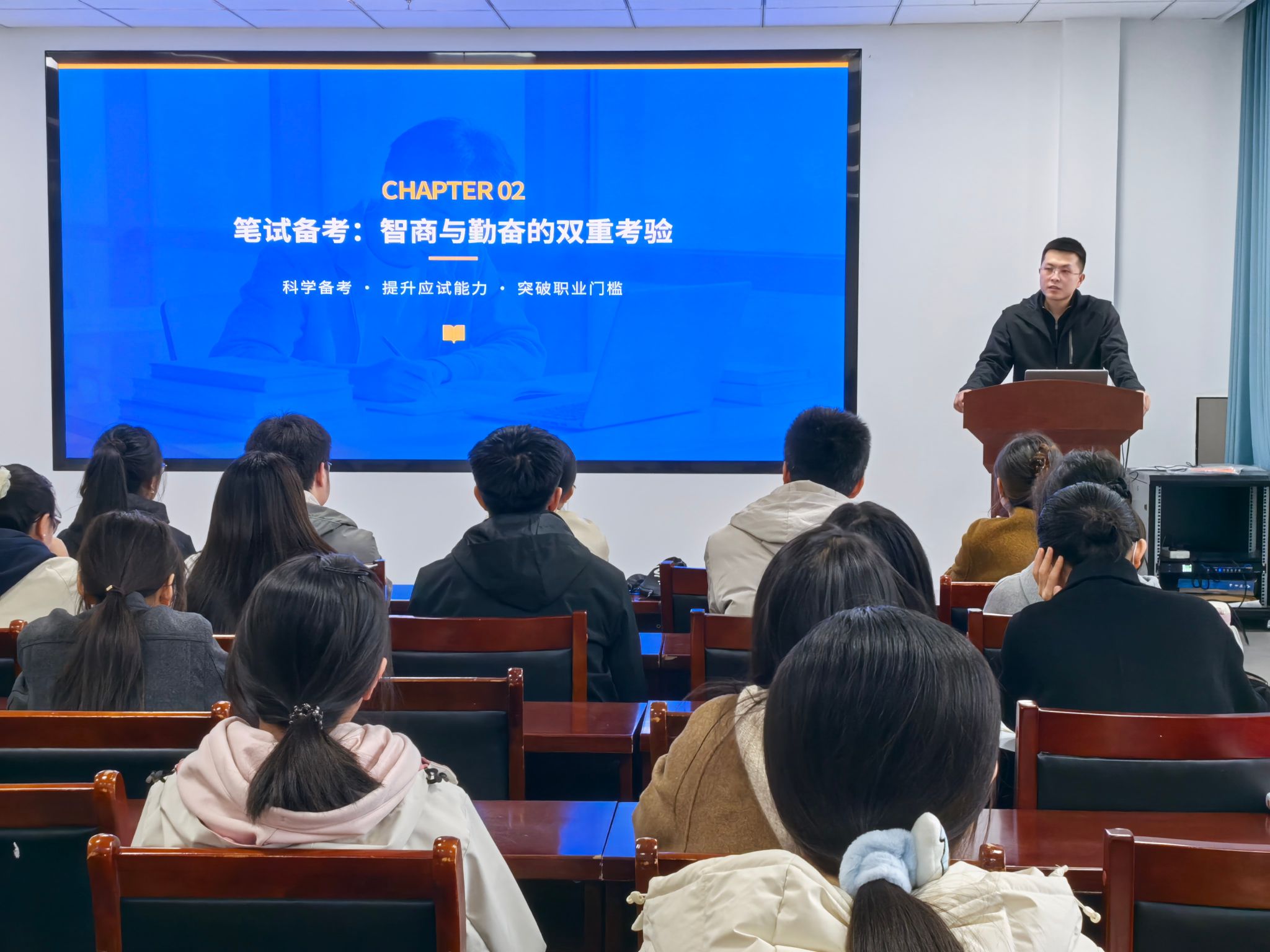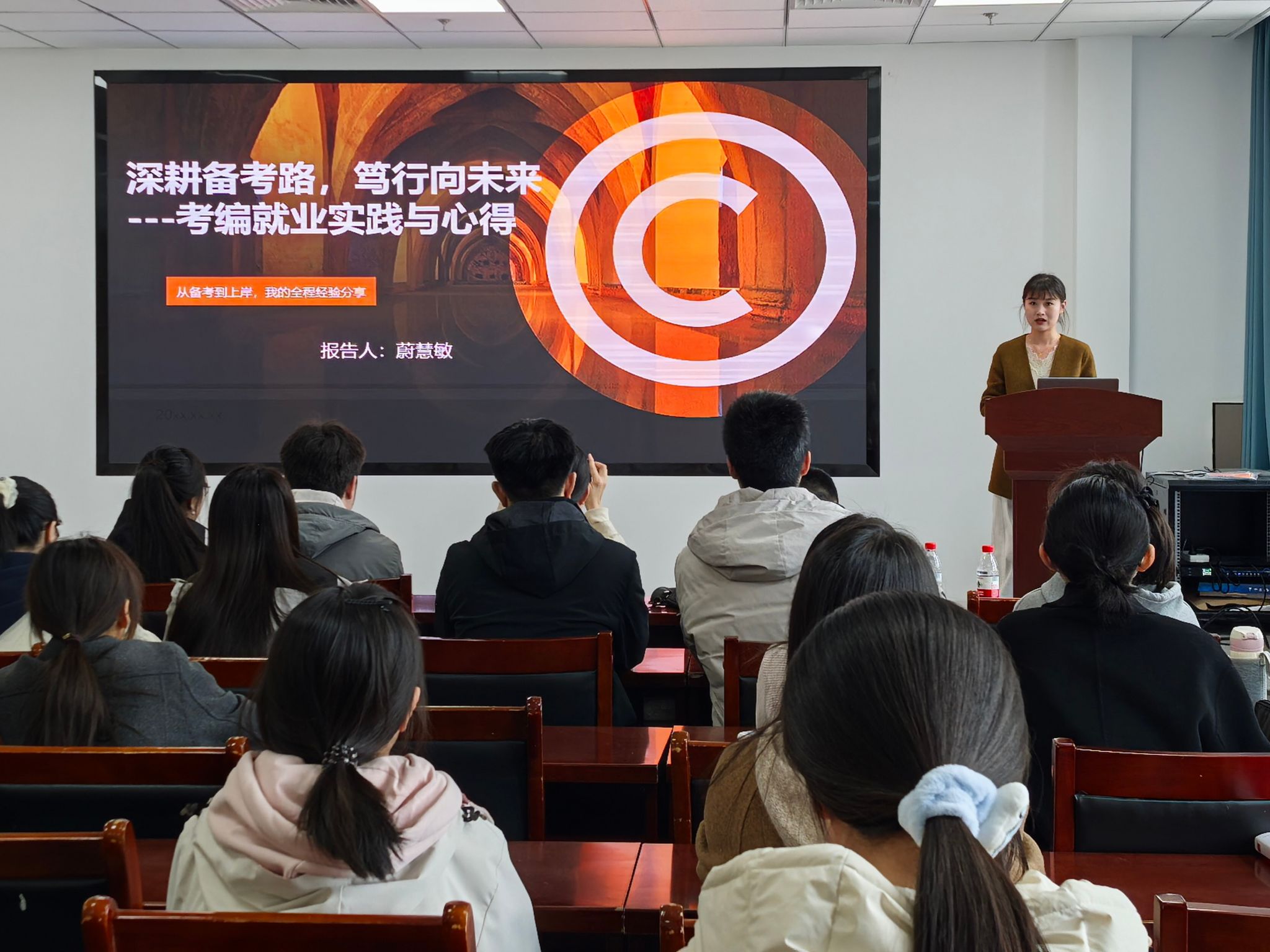 会上,两位校友分别围绕教师考编与公务员考试,从政策解读、职业规划、备考策略、面试技巧、心理调适等方面进行了细致深入的分享。蔚慧敏聚焦教师编备考,从笔试与面试试讲两个维度展开讲解。她建议同学们在备考阶段紧扣考试内容精准复习,通过制定备考时间表、构建知识体系、强化真题演练、注重错题复盘等方式夯实基础,同时做好心态调节,以积极状态应对求职考试。杨光宇以“以选为志,以考为径”为主题,系统讲解了公务员考试全流程的备考要点。他首先梳理了体制内岗位分类及研究生考公定级薪资特点,提醒大家仔细研读招考公告,并结合自身求职与工作经历,从笔试、面试、岗位选择、职业规划等方面提出了诸多宝贵建议。
