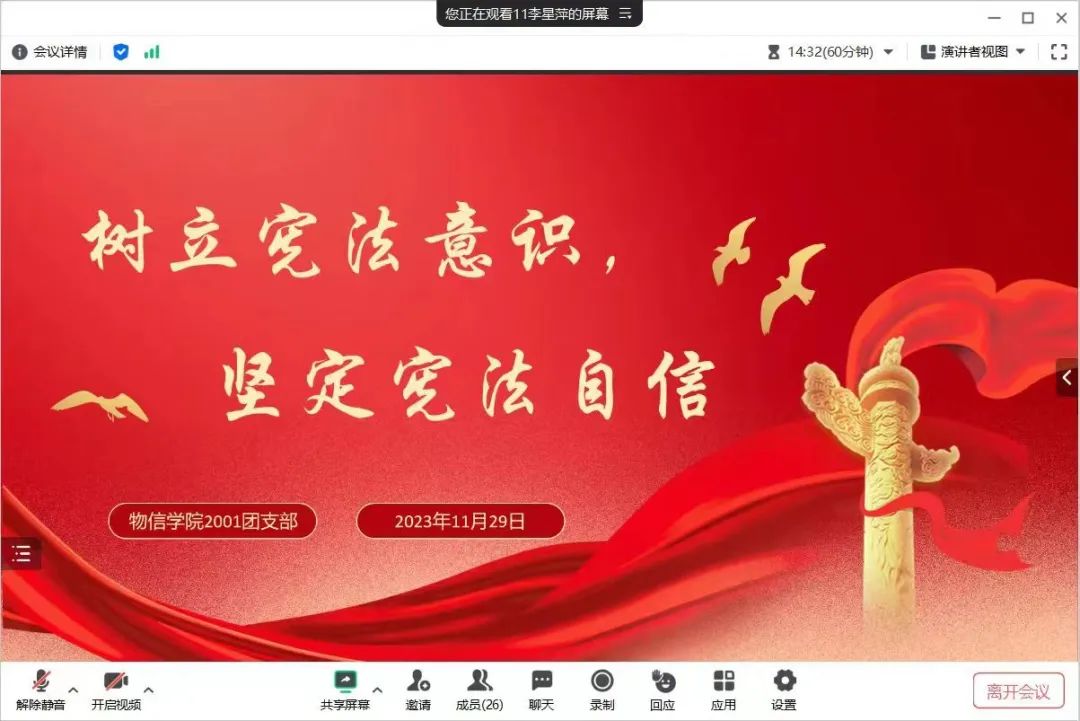 为树立法治意识,增强法治观念,云顶Casino 2001团支部于2023年11月29日晚上20:30以线上腾讯会议的方式开展“树立宪法意识,坚定宪法自信”主题团日活动。本次团日活动由团支书李星萍主持。