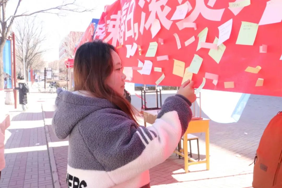 活动以四种形式展开。同学们在便签上记录下当天的心情,又或者将美好的祝愿以不同方式遥寄给自己所深爱的女性,比如母亲、老师、爱人;此外,也有的同学积极分享对于电影“热辣滚烫”的感悟以及里面的经典台词。最后,也有人写下女性应该被撕掉的标签,打破性别刻板印象对女性的影响。