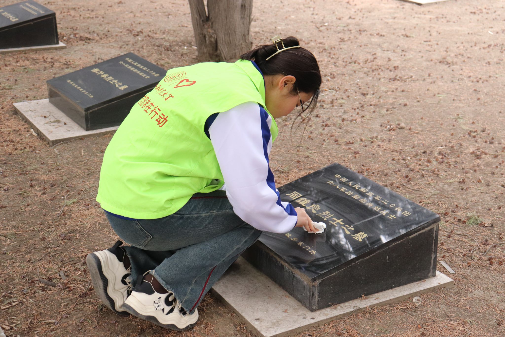 最后,青马学员在青协志愿者们的带领下,怀着无比崇敬的心情,认认真真地为烈士们清扫“落在肩上的灰尘”,经过大家的辛勤擦拭,烈士墓碑焕然一新。