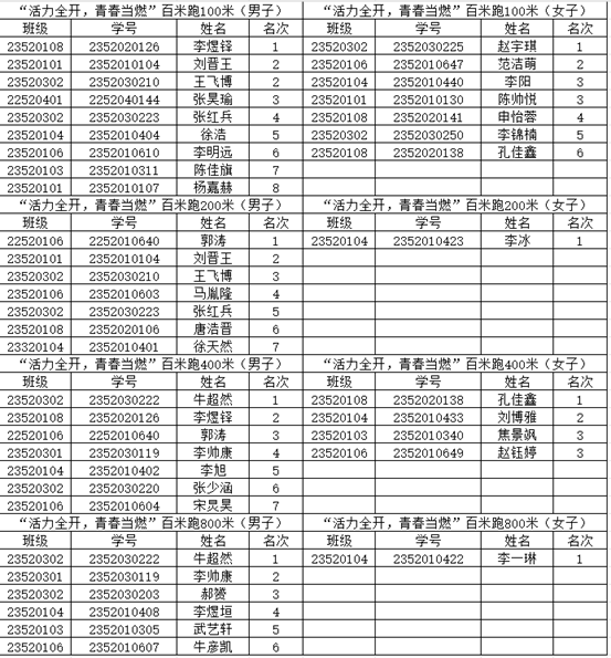 本次活动分为男子组和女子组,共有100米、200米、400米和800米四种运动形式。赛前,选手们紧张而有序,做好热身运动,调整心态,站在起跑线上。他们目光坚定,信心满满,等待着发令枪响起,便全力以赴,追逐胜利的脚步。在比赛过程中,同学们积极参与,充分发挥各自的优势,你追我赶,力争上游,活动现场气氛热烈。选手们通过努力拼搏,展示了青春的风采和坚定的意志。此次比赛决出男子组和女子组中100米和400 米的前六名,与200米和800米的前两名参加校运会。