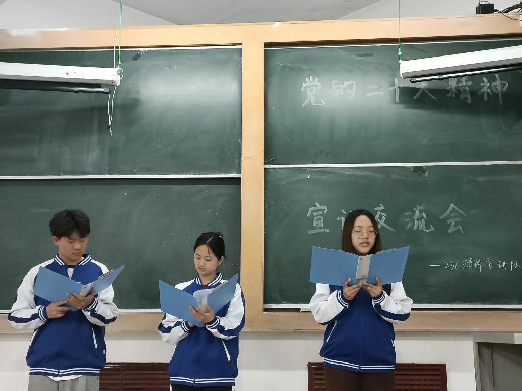 部分学生,236精神宣讲队围绕“党的二十大精神”宣讲了《从“两个务必”到“三个务必”》、《把不可能变成可能》两个故事,宣讲队员们铿锵有力、激情饱满,营造出热烈浓厚的宣讲学习氛围。交流会期间,同学们认为,当代大学生应当全面深刻领悟“两个确立”的决定性意义,增强“四个意识”、坚定“四个自信”、做到“两个维护”,不忘初心、牢记使命,为祖国发展贡献自己的一份力量。