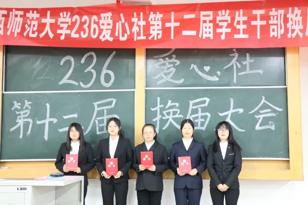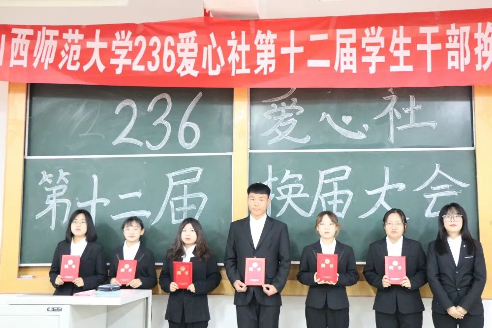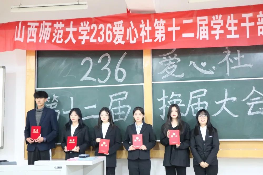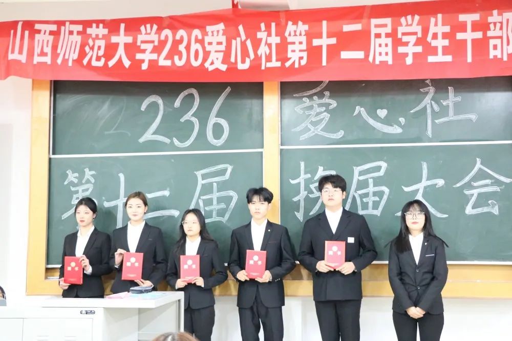 会上,主持人首先介绍了第十二届社团负责人:郭珂钰、李双宏、丁福增、郭佳宁、付旭敏、黄钰斐、刘卓嫄、武彬伟。由上届236爱心社负责人田佳慧为他们颁发聘书,并对他们致以诚挚的祝福。