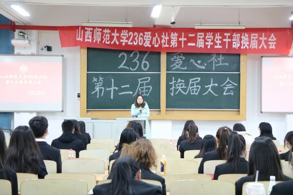 11月13日晚7:00,236爱心社在南区五号楼5409教室举办了第十二届换届大会。校社联代表、院团委学生会负责人代表、236爱心社第十一届各部门负责人和第十二届各部门负责人以及大一部分学生参加了大会。院专职组织员郭桂春、专职辅导员刘艳红出席了本次大会。
