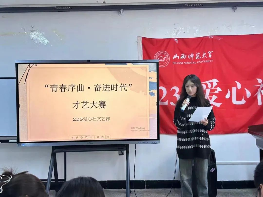 为搭建展示236爱心社成员展示自我的平台,充分发挥社团成员的才能和潜力。11月4日下午,236爱心社于南区实验楼S202教室举办“青春序曲,奋进时代”才艺大赛。本次活动由236爱心社文艺部王姝亚主持。