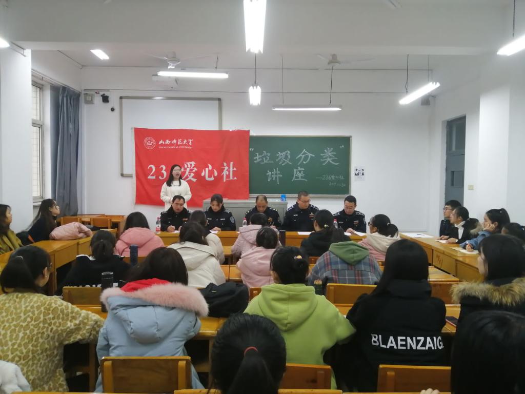 2019年11月30日上午,236爱心社在07307教室开展了“垃圾分类”专题讲座。此次讲座由临汾市环境卫生管理局南城所指导员王国俊主讲。236爱心社部分社员聆听了此次讲座。