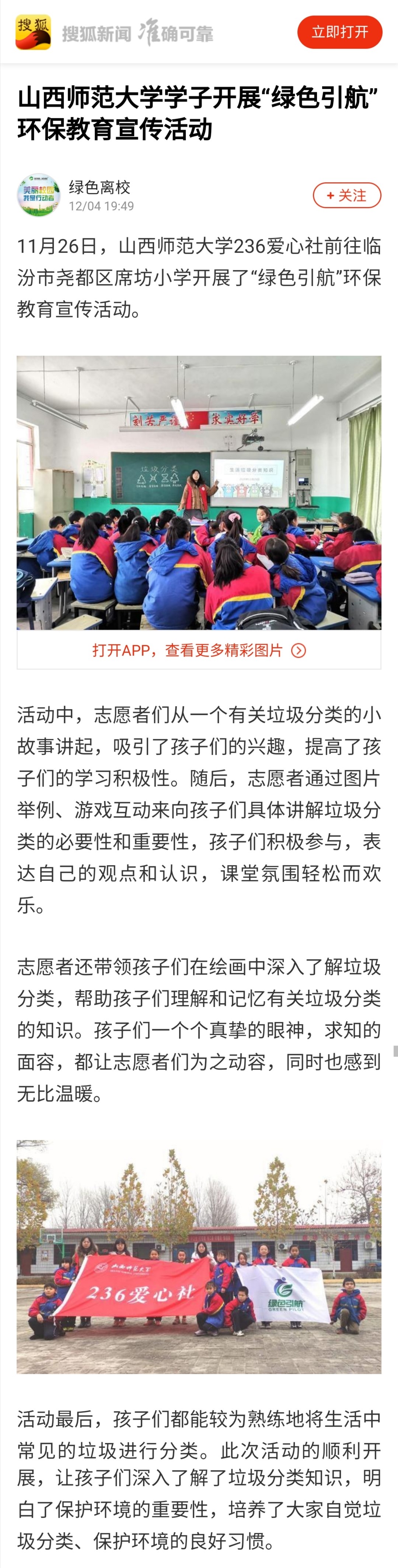 12月4日,搜狐新闻客户端以“山西师范大学学子开展‘绿色引航’环保教育宣传活动”为题报道了云顶Casino