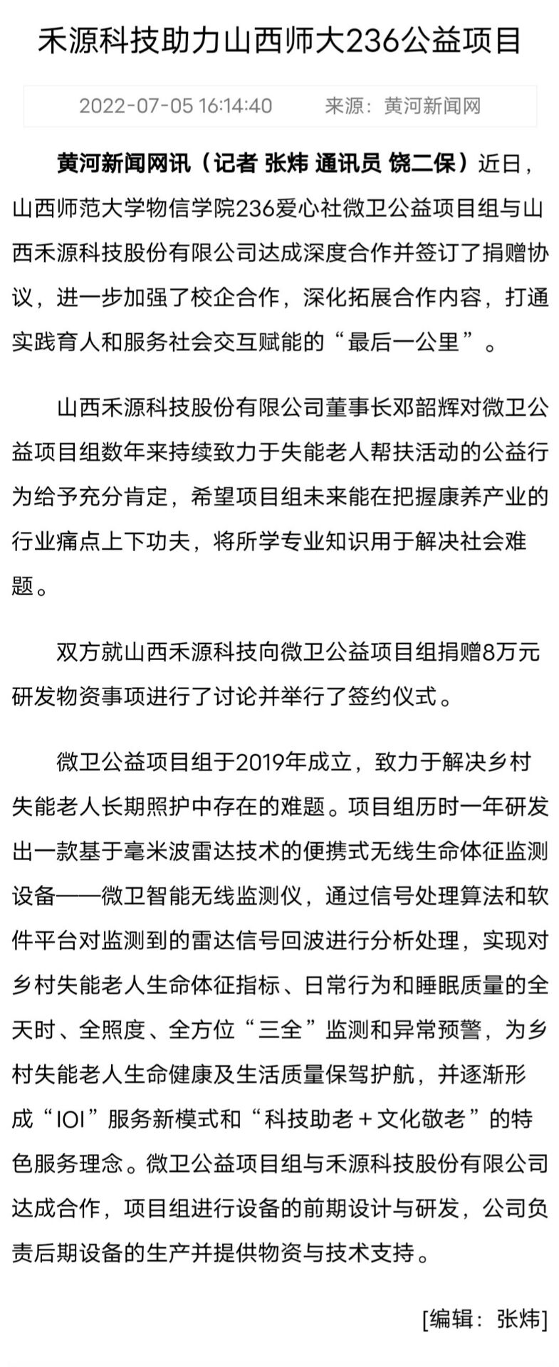 7月5日,黄河新闻网以“禾源科技助力山西师大236公益项目”为题,报道了云顶Casino 236爱心社微卫公益项目组与山西禾源科技股份有限公司达成深度合作并签订捐赠协议。