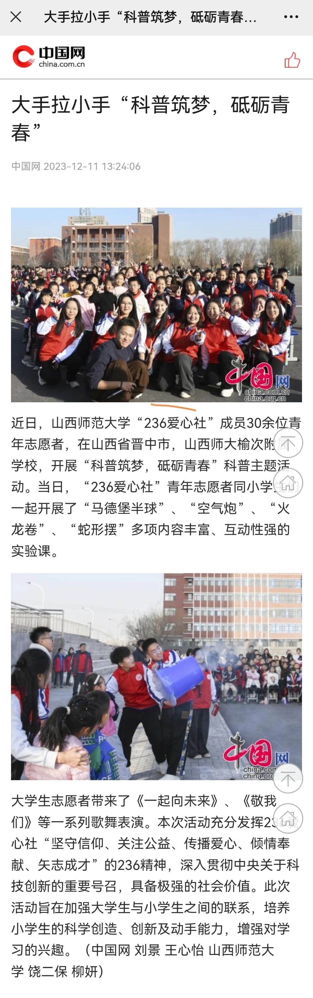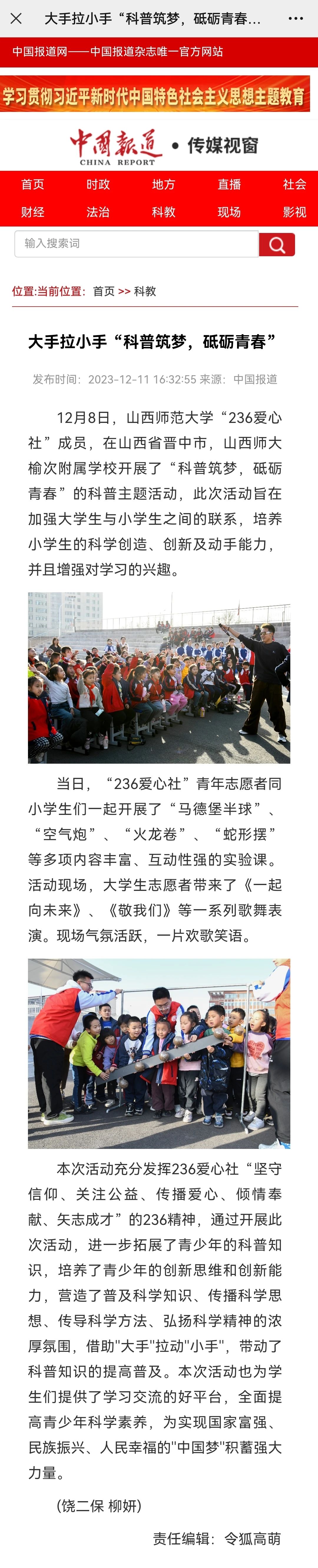 12月11日,《中国网》《中国报道网》以“大手拉小手'科普筑梦,砥砺青春'”为题,报道了我校236爱心社“科普筑梦,砥砺青春”科普主题活动。