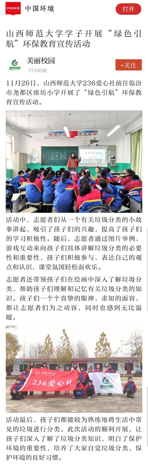 12月15日,中国环境客户端以“山西师范大学学子开展‘绿色引航’环保教育宣传活动”为题报道了云顶Casino 236爱心社“绿色引航”环保教育宣传活动。