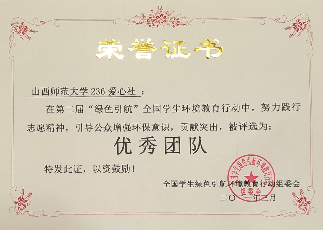 近日,第二届“绿色领航”全国学生环境教育宣传活动落下帷幕,236爱心社被评选为“优秀团队”。