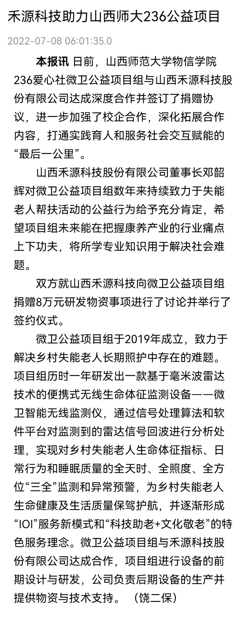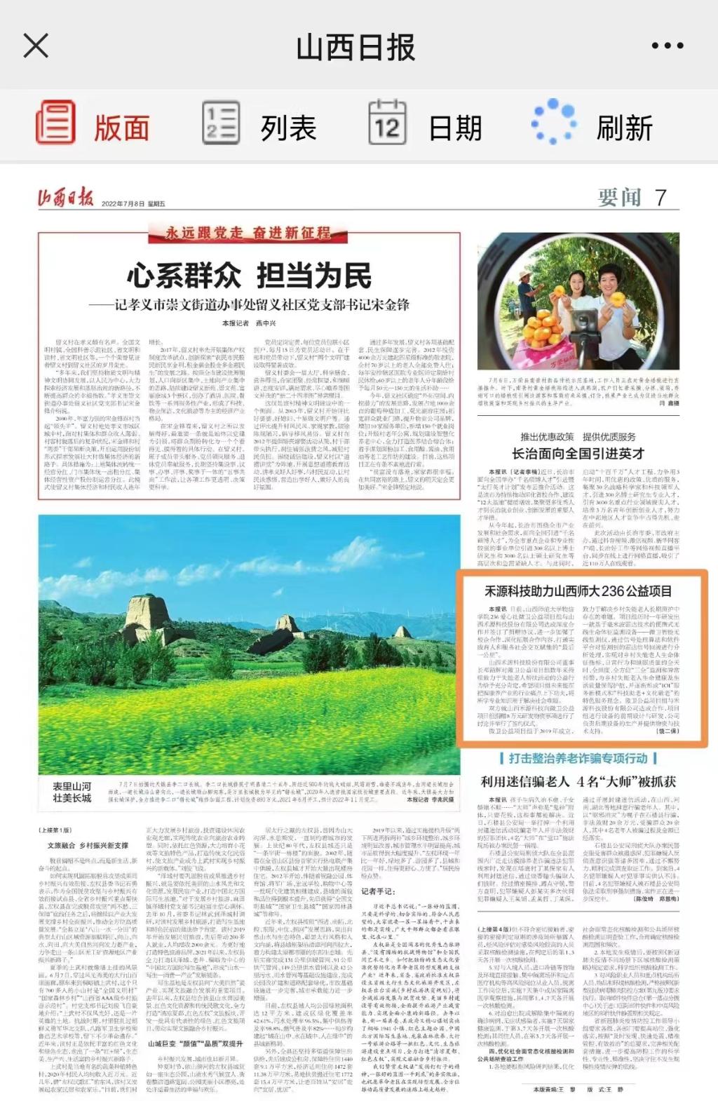 7月8日,山西日报要闻第7版以“禾源科技助力山西师大236公益项目”为题,报道了云顶Casino