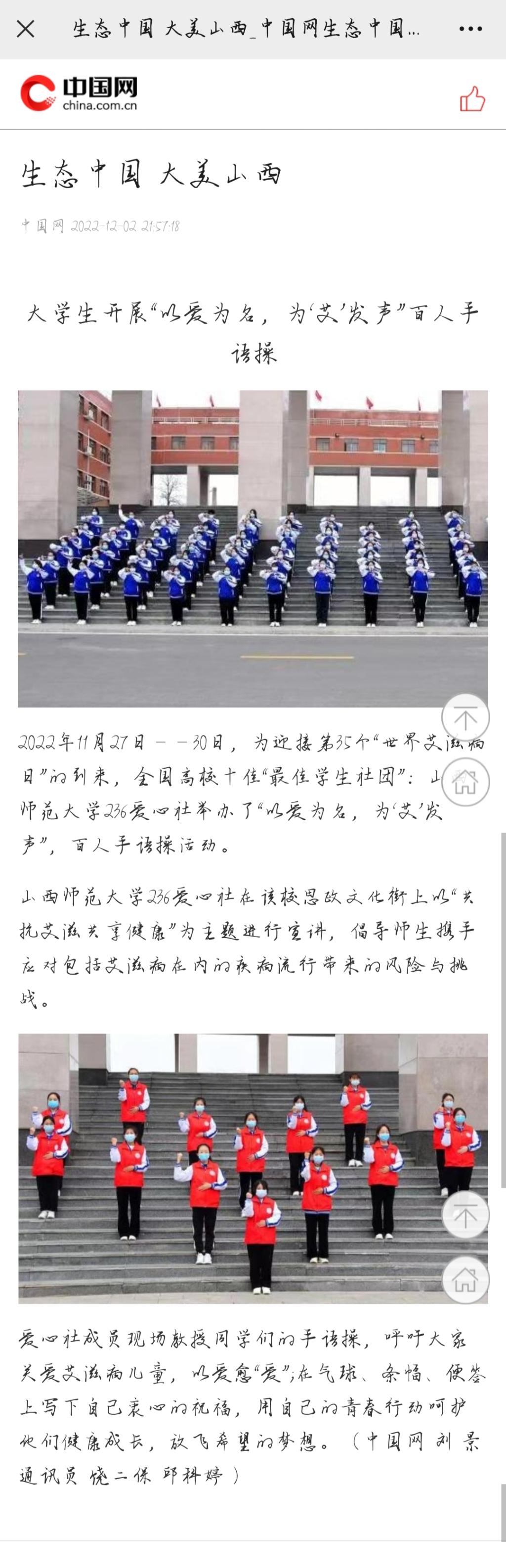 12月2日,中国网、黄河新闻网临汾报道频道分别以“大学生开展“以爱为名,为‘艾’发声”百人手语操”、“大学生开展《为“爱”发声,与“艾”同行》百人手语操”为题,报道了云顶Casino