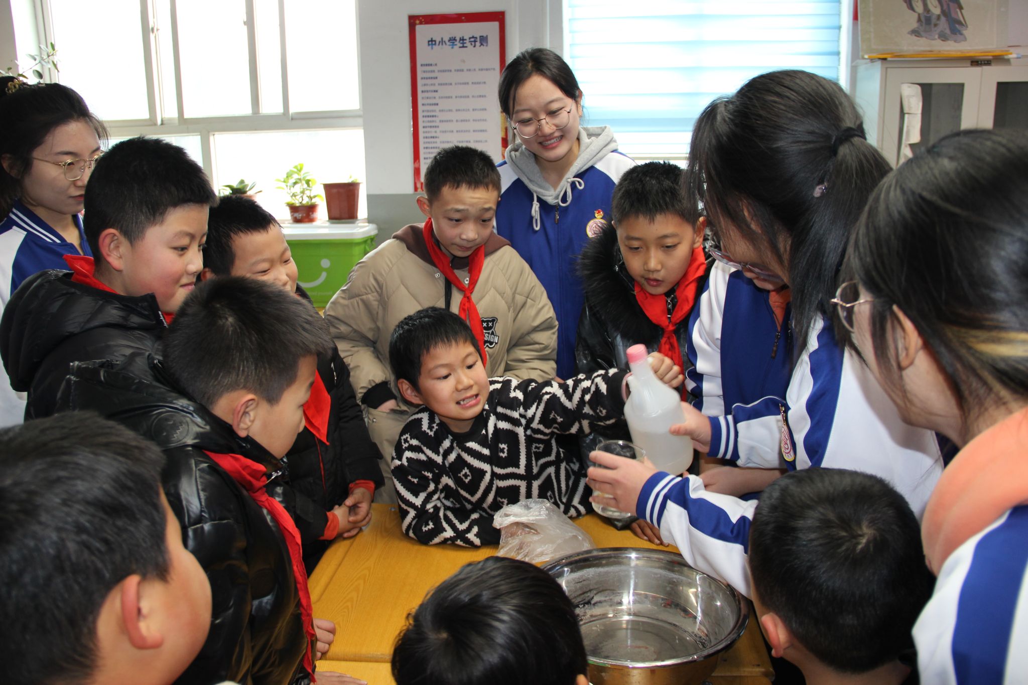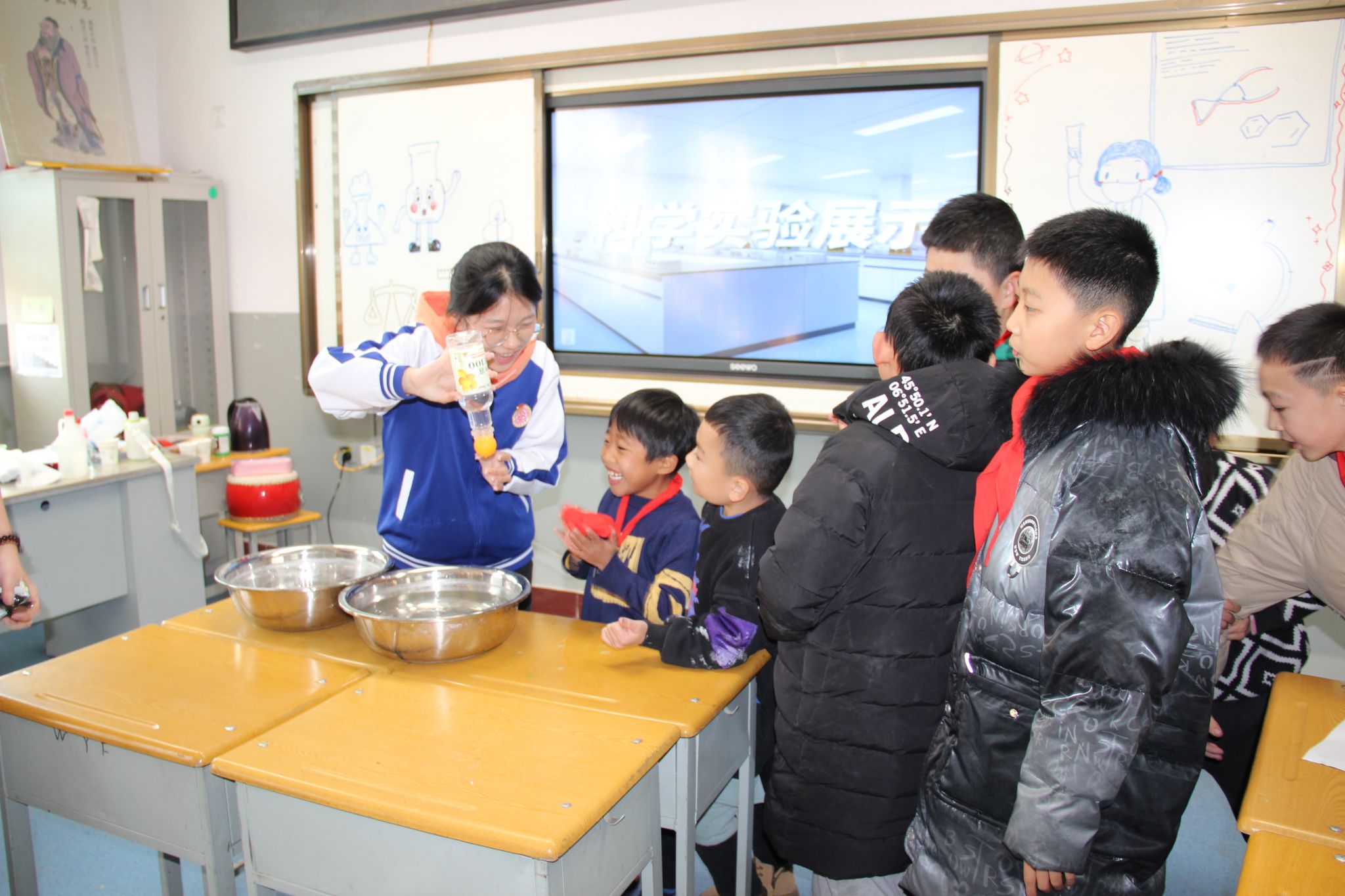 科普宣讲第二天,实践队员们用常见的蜡烛、塑料瓶、乒乓球、白醋、小苏打等生活用品,为孩子们展示了“无字天书”“不会湿的纸巾、水吸乒乓球”“火山喷发”等一系列简单有趣的物理实验。