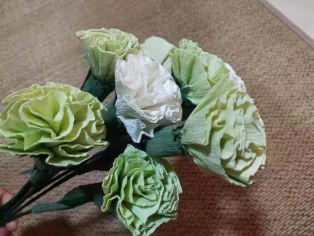 作品介绍:这是拿纸和铁丝做成的康乃馨,有白色的和绿色的,既环保又好看,生动的诠释了变废为美。
