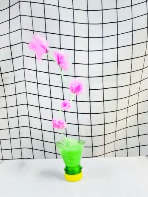 作品介绍:通过各种废弃材料相互组合,制成美人梅的模样,给人眼前一亮的感觉,让我们感受到植物美好的同时意识到废物利用的价值。