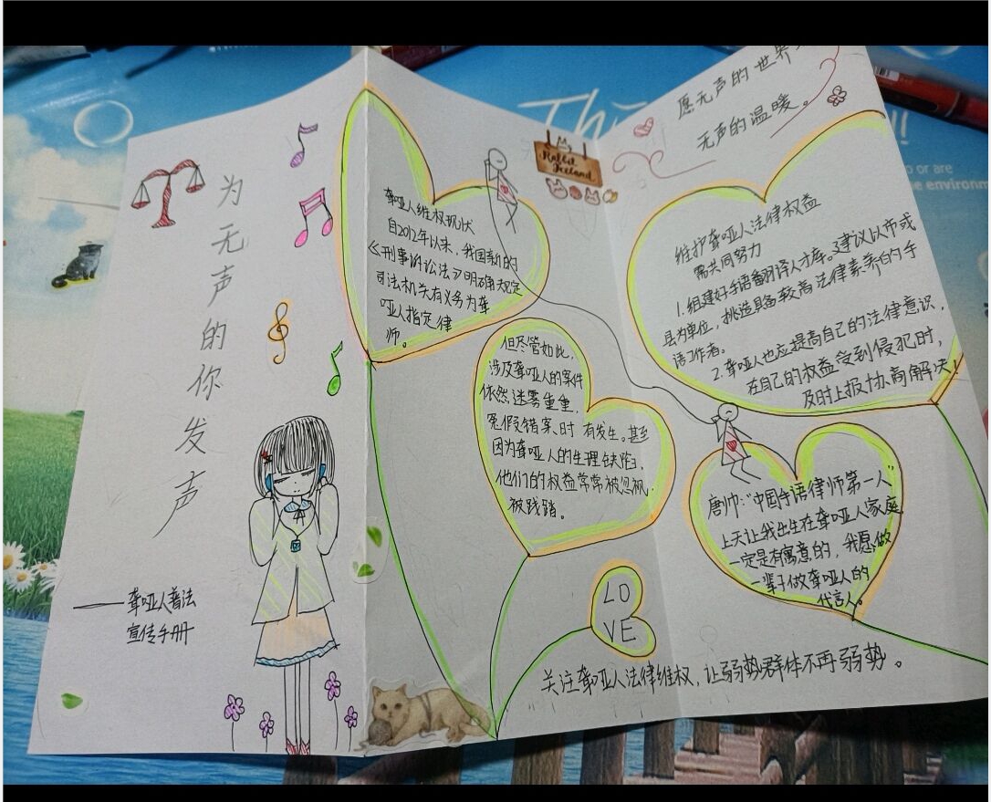 本次活动以大学生提升法律意识,帮助聋哑人保护自己为主要内容,活动形式包括制作宣传册、绘制海报和拍摄视频等多种形式。同学们通过制作图文并茂的宣传册大家了解了聋哑人维权不易的现状、鼓励大家关注聋哑人法律维权,帮助聋哑人掌握正确的维权途径。一幅幅画面精美的海报增强了同学们的法治观念,提高了同学们的法律意识。同学们还共同拍摄了手语宣传视频,来为聋哑人等弱势群体提供帮助。