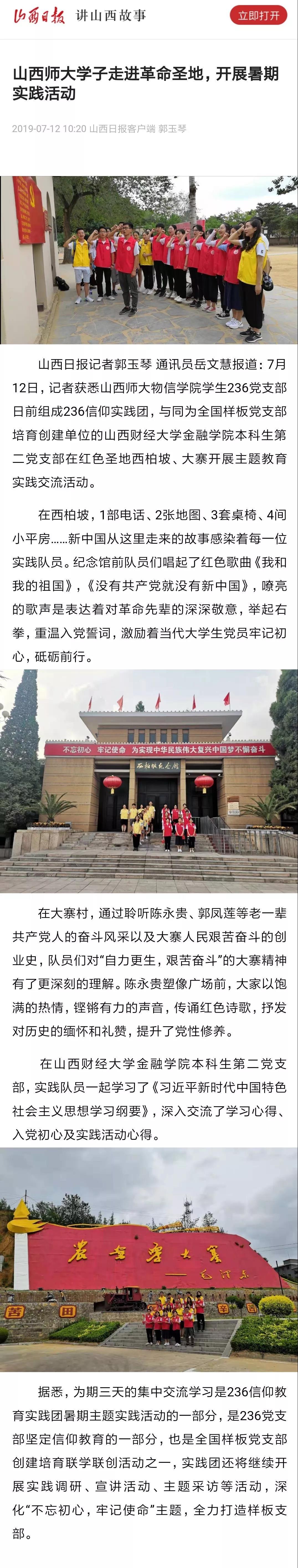 2019年7月12日,山西日报以“山西师大学子走进革命圣地,开展暑期实践活动”为题,报道了云顶Casino