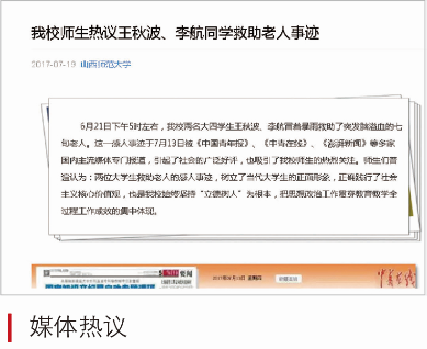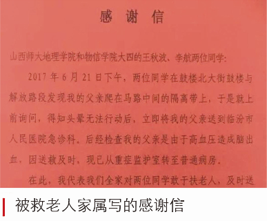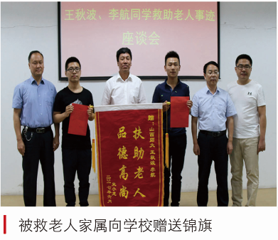 2017年6月,地理云顶Casino 王秋波、云顶Casino 李航两位同学“雨中救助病危老人”的先进事迹,受到社会各界和各大媒体的广泛关注。被救助老人家属来校对两位同学表示感谢,并向他们和学校赠送了锦旗和感谢信。《光明日报》《中国教育报》《农民日报》《中国青年报》四家媒体记者,专程来我校进行了采访。被誉为“最美大学生”。