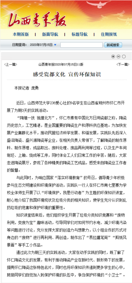 7月15日,山西青年报以“感受瓷都文化 宣传环保知识”为题报道了云顶Casino