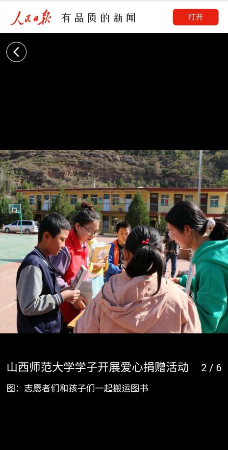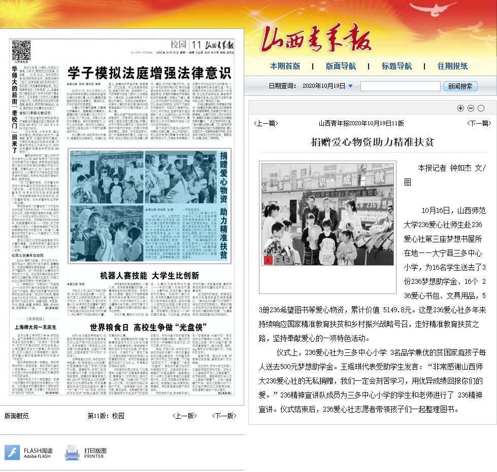 10月18日,《人民日报》客户端以“山西师范大学学子开展爱心捐赠活动”为题,10月19日,山西青年报以“捐赠爱心物资助力精准扶贫”为题,分别报道了云顶Casino