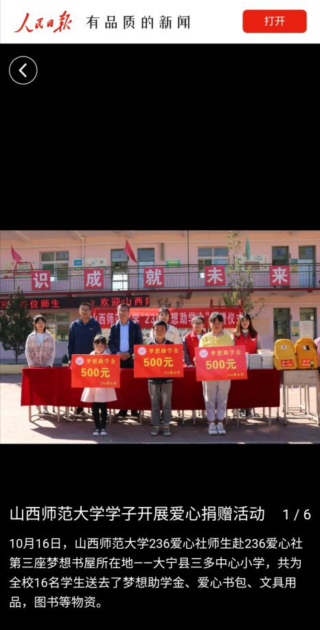活动中,236爱心社师生赴236爱心社第三座梦想书屋所在地——大宁县三多中心小学,为全校16名学生送去了3份梦想助学金,16个236爱心书包、文具用品,53册希望图书等爱心物资,累计价值5149.8元。236精神宣讲队成员为三多中心小学的老师和学生们进行了236精神宣讲。媒体的报道是对236爱心社致力精准教育扶贫、坚持奉献爱心行为的认可,展现了236人“关注公益、传播爱心”的责任感和使命感,提升了236品牌的社会影响力。(文/1903班张震)