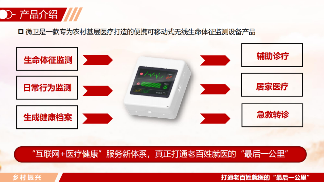 项目简介:“微卫”项目依托“互联网+远程诊疗”的新型诊疗服务模式,聚焦农村医疗资源分配不均、医疗设施落后、慢性病防控能力不足等问题,为目标群体研发了一款可远程连接的移动式生命体征监测设备——“微卫”。项目致力于实现乡村医疗卫生信息化处理后台的搭建以及设备前端数据的采集,通过互联网将“微卫”设备与医疗专家连接,实现远程诊断和治疗;将日常记录用户的电子档案从乡村卫生所上传给乡镇医院、县医院,切实搭建好县乡村三级转诊网络。项目从初期至今,已取得初步成效:产品已迭代升级至二代版本,并与禾源科技股份管理有限公司签署了校企合作及捐赠协议。