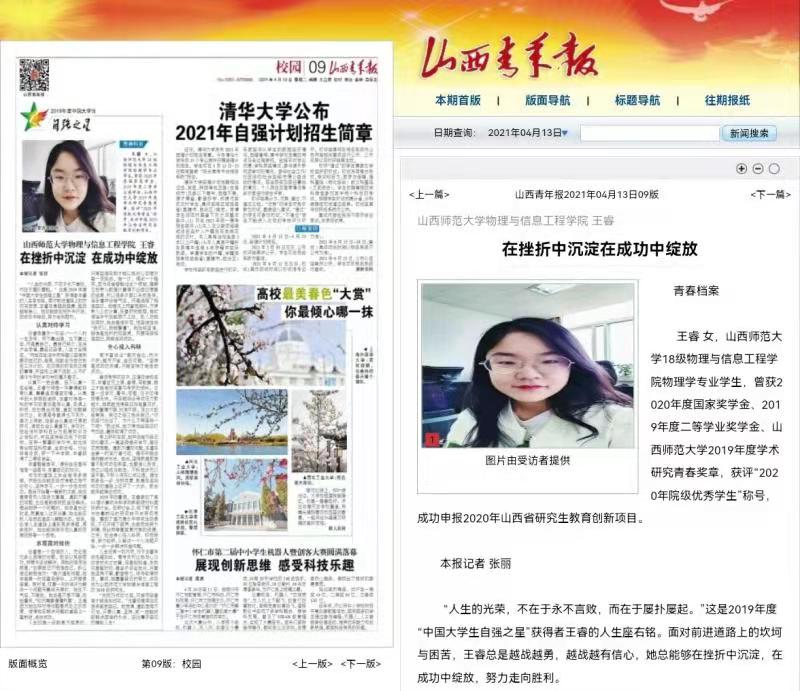 2018级研究生王睿以第一作者的身份在Chemistry of Materials发表了一篇科研成果,且主持了2020年的省级创新项目[2020SY328],荣获2019年度“中国大学生自强之星”,并受到《山西青年报》专题采访报道。被誉为“最美自强者"。